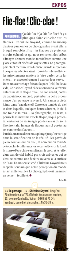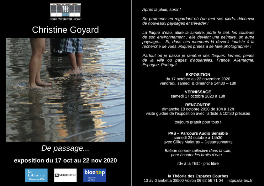 2020 : du samedi 17 octobre au dimanche 22 novembre Prolongée jusqu'au 22 décembre 2020 EXPOSITION "de Passage" à la TEC VOIRON http://la-tec.fr/ avec Gilles MALATRAY/DESARTSONNANTS VERNISSAGE samedi 17 octobre à 18h rencontre avec le public dimanche 18 octobre de 10h à 12h